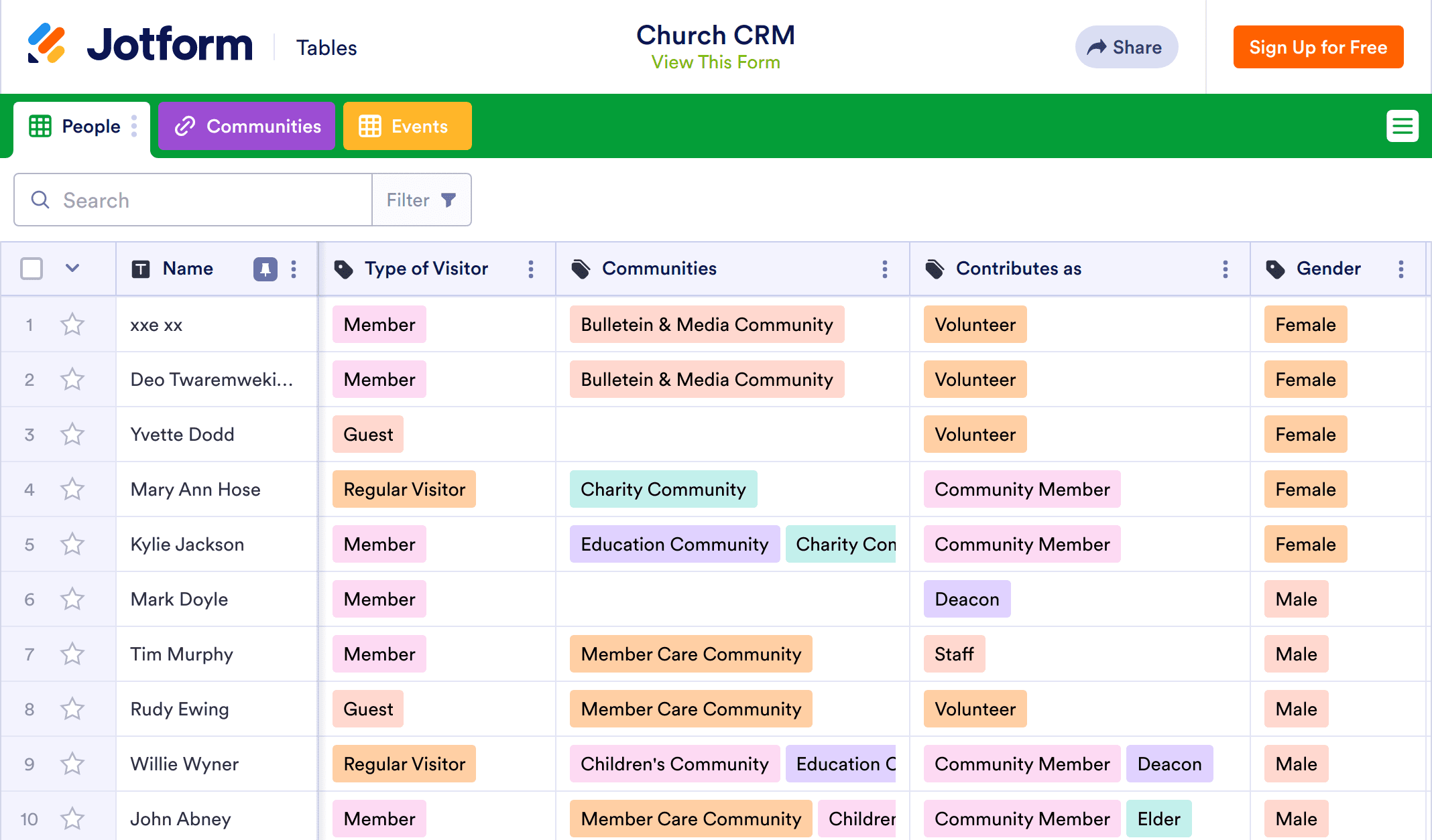 CRM systems are definitely an effective way to manage relationships within an organization and most definitely a useful tool to keep the data of members and visitors of a Church, track events and activities and manage communities within the Church. Our Church CRM is composed of tabs where you can keep personal and contact data of your members, regular visitors, or guests; determine their contribution to you communities; easily track and manage events by selecting their status, determining their frequency, adding the relevant community and responsible person to the event; add your communities with their hosts and members.