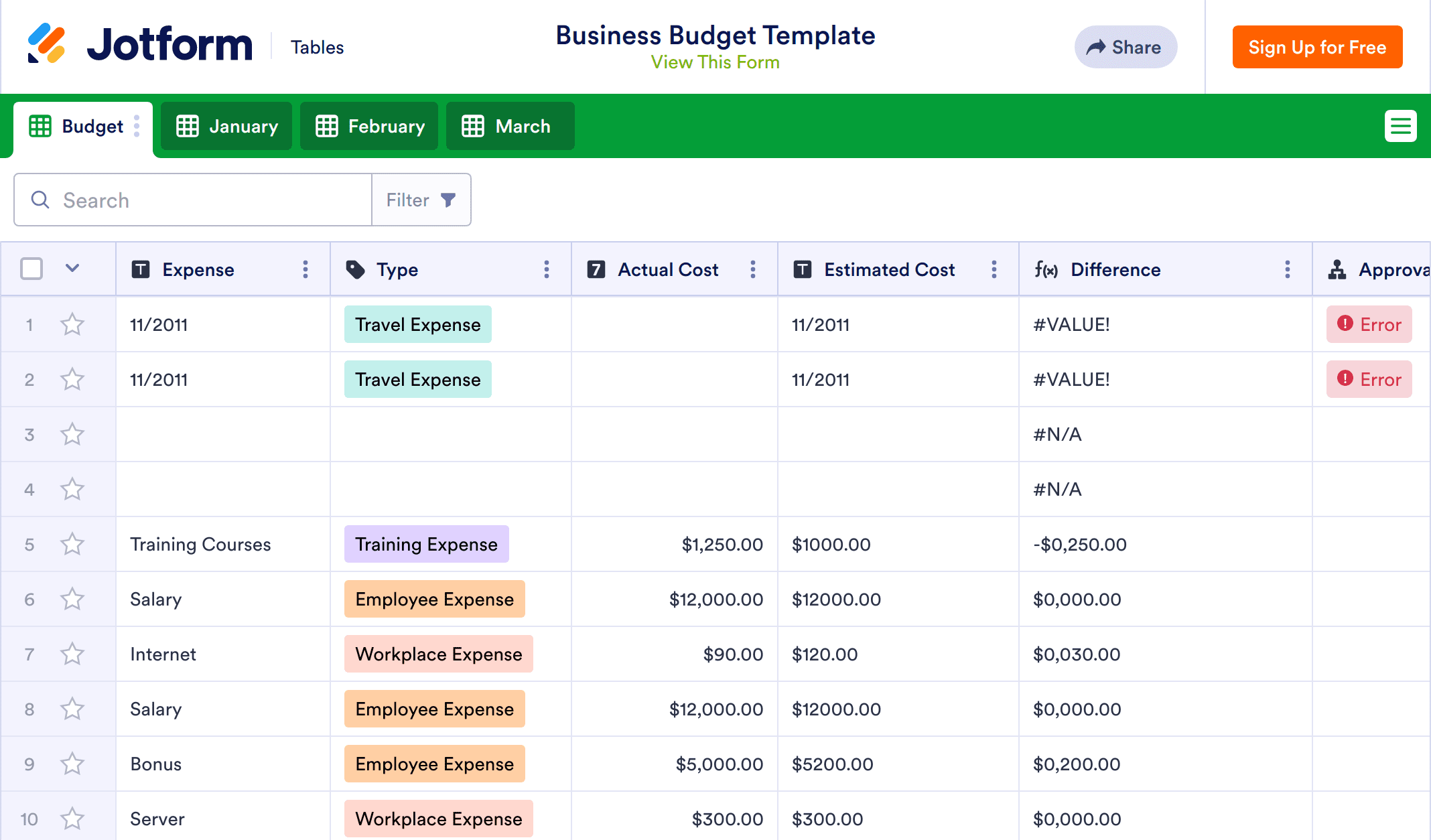 Take care of business with this free online Business Budget Table! Manage and track your expenses more efficiently with Jotform Tables, an easy-to-use database-spreadsheet hybrid. To get started, simply enter your budget through the attached form or directly to the Business Budget Table in order to manage and efficiently track your expenses. In just a few clicks, you can create new columns, rows, and color-coded labels, add tabs for different months, and set up formulas to perform instant calculations automatically.