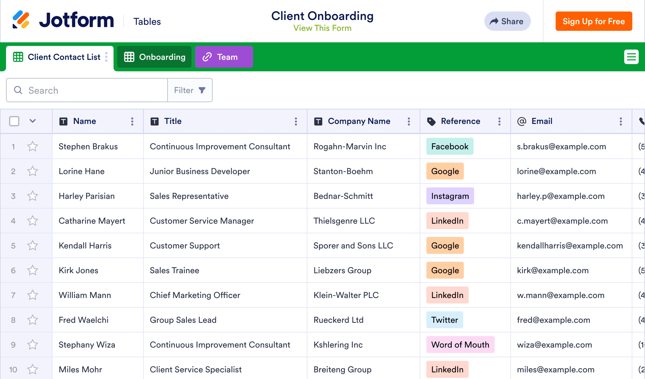 Customizing this Client Onboarding to perfectly match your onboarding process doesn’t require any coding. Just drag and rearrange rows and columns, change label names and colors, and add new tabs to organize client data. You can even switch to card view to separate client information into easy-to-read cards. And with just a few clicks, you’ll be able to download, print, assign and share your Client Onboarding Sheet with others for seamless team collaboration. With a custom Client Onboarding Sheet Template, you can more efficiently welcome new clients to your business and foster better customer relationships!