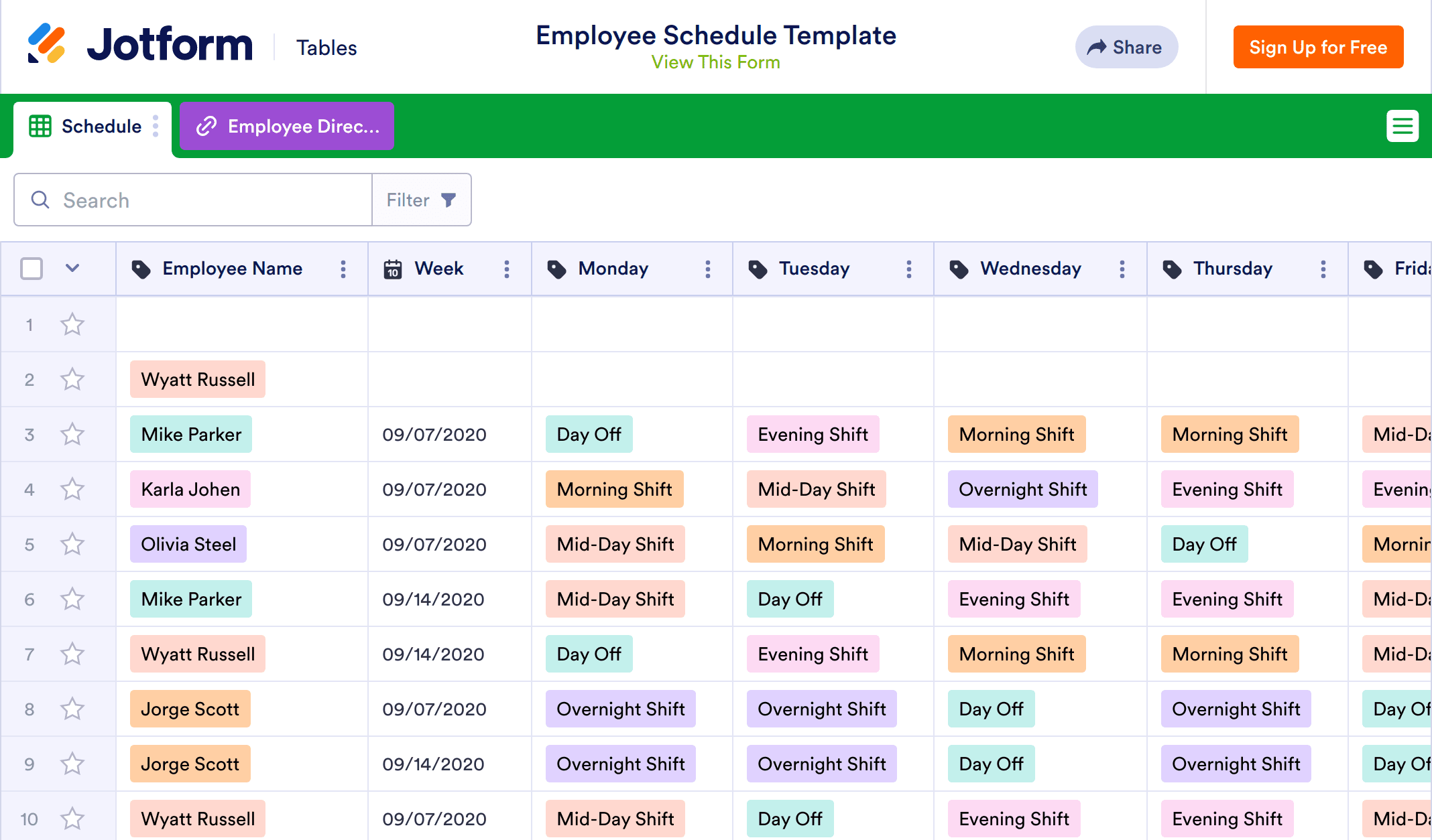 An employee schedule template helps an employer or manager keep track of employee shifts. Without any coding, our free online Employee Schedule Template will help you record and organize important employee information and their schedules. Simply enter shift details into the spreadsheet provided, or set up an employee schedule request form to automatically populate your sheet template with schedule data. You can easily view and edit the spreadsheet from any desktop or mobile device, and you’ll also be able to share and print it if needed.