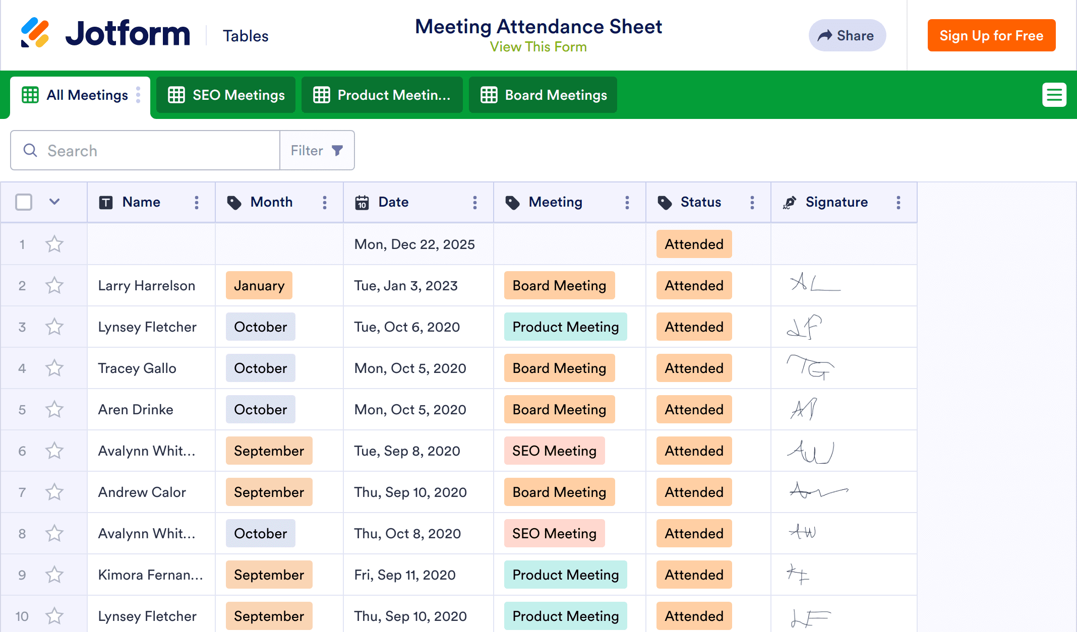 Make this template match your company by updating label names and colors, adding new tabs for different departments, or rearranging the layout by moving rows and columns. You can even upload files like PDFs and PowerPoint presentations to store your meeting notes as well, or share the attached form as a QR code to help employees fill it out faster. With a free online Meeting Attendance Sheet helping you expertly track meeting attendance, you can quickly see which meetings your employees are attending and better manage your company.