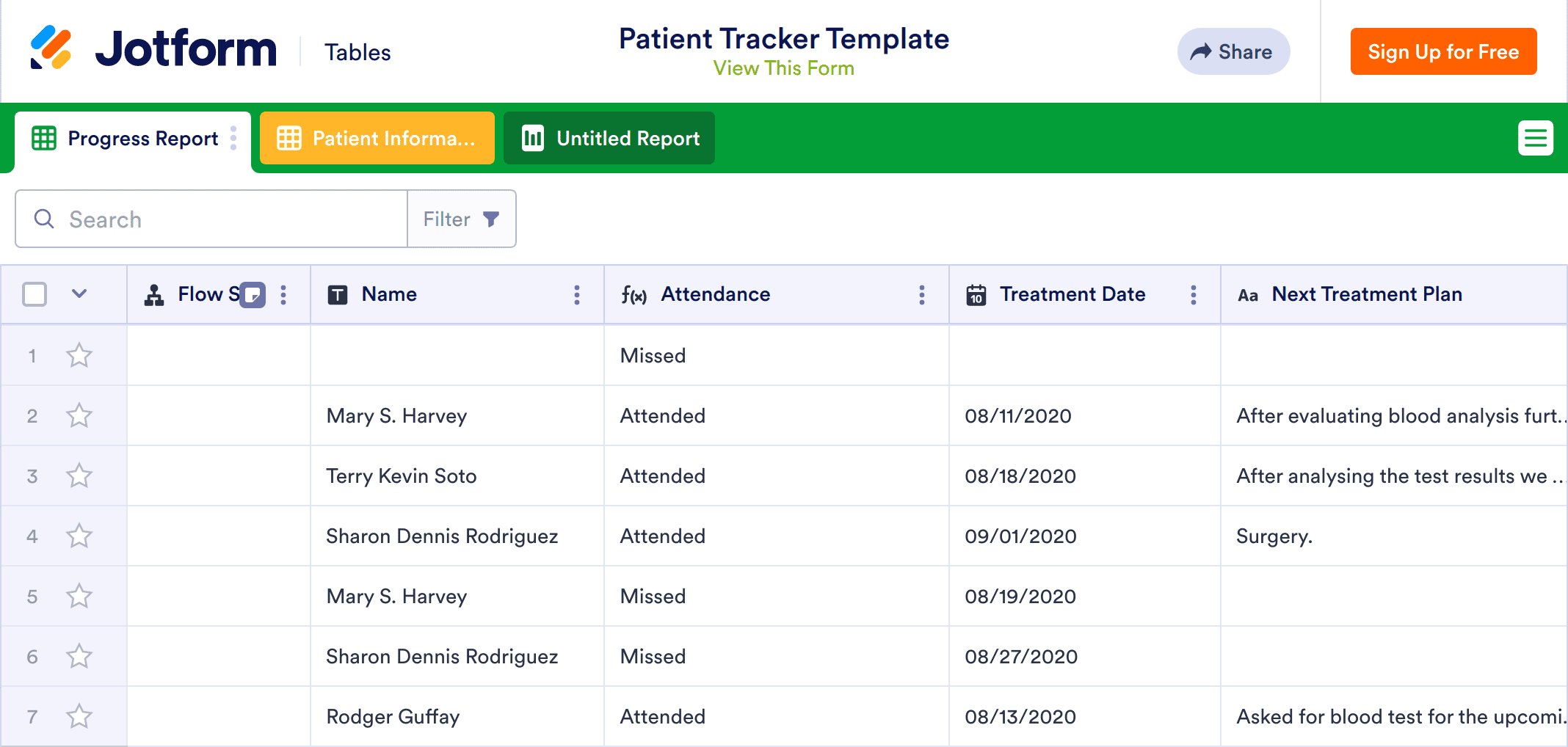 In 2025, this Patient Tracker Template is trusted by doctors and healthcare professionals to monitor patient status as they receive treatment. Whether you’re a primary care physician, physical therapist, psychiatrist, medical specialist, or part of a care team, our Patient Tracker will help you consistently monitor your patients’ health. Quickly enter patient information and appointment details — like name, treatment date, attendance, and progress notes — to reduce errors and ensure smooth continuity of care. You’ll be able to access and update your Patient Tracker Template securely from any desktop or mobile device in 2025, and you may also share this information with patients and other medical staff in just one click.