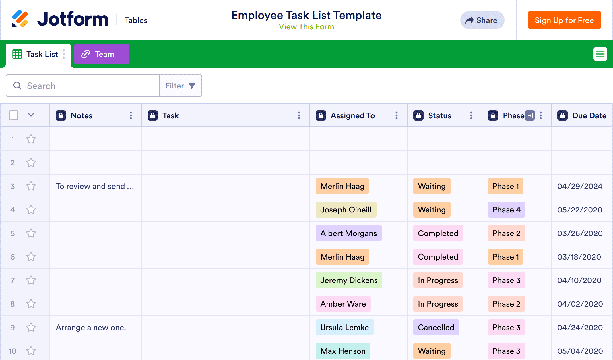 Add unique label colors for task statuses, put your deadlines into a calendar, or add new rows and columns to include new employees. It takes just a few clicks to customize this Employee Task List Template to your liking! No matter the size of the team you’re in charge of, using an online spreadsheet can help your team stay on track — so use Jotform’s free Employee Task List Template to manage employee tasks and boost productivity.