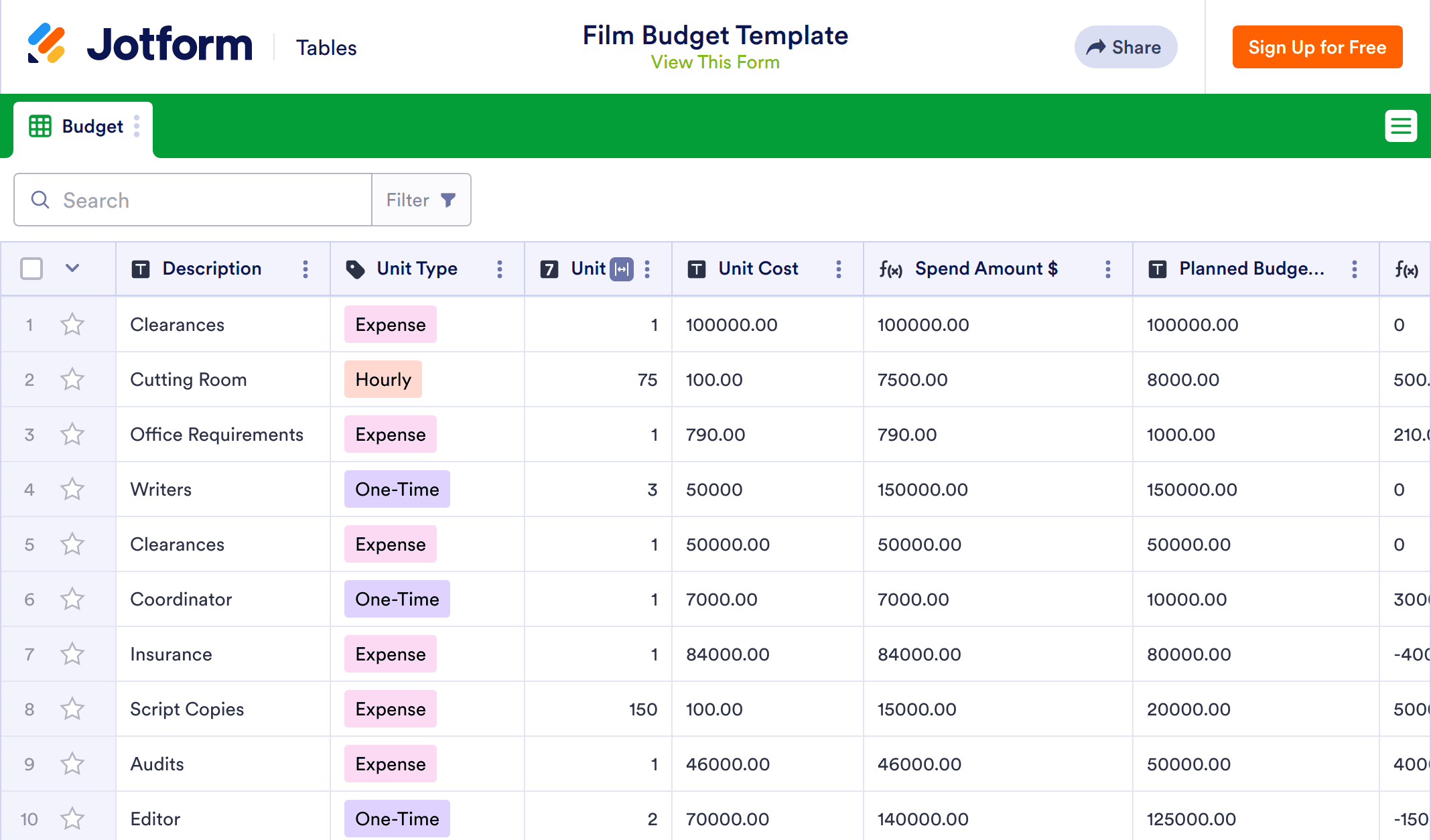 If you’re searching for a way to keep your film crew and cast on budget, consider creating a film budget. Jotform Tables provides an easy and intuitive way to build and manage your own film budget.
