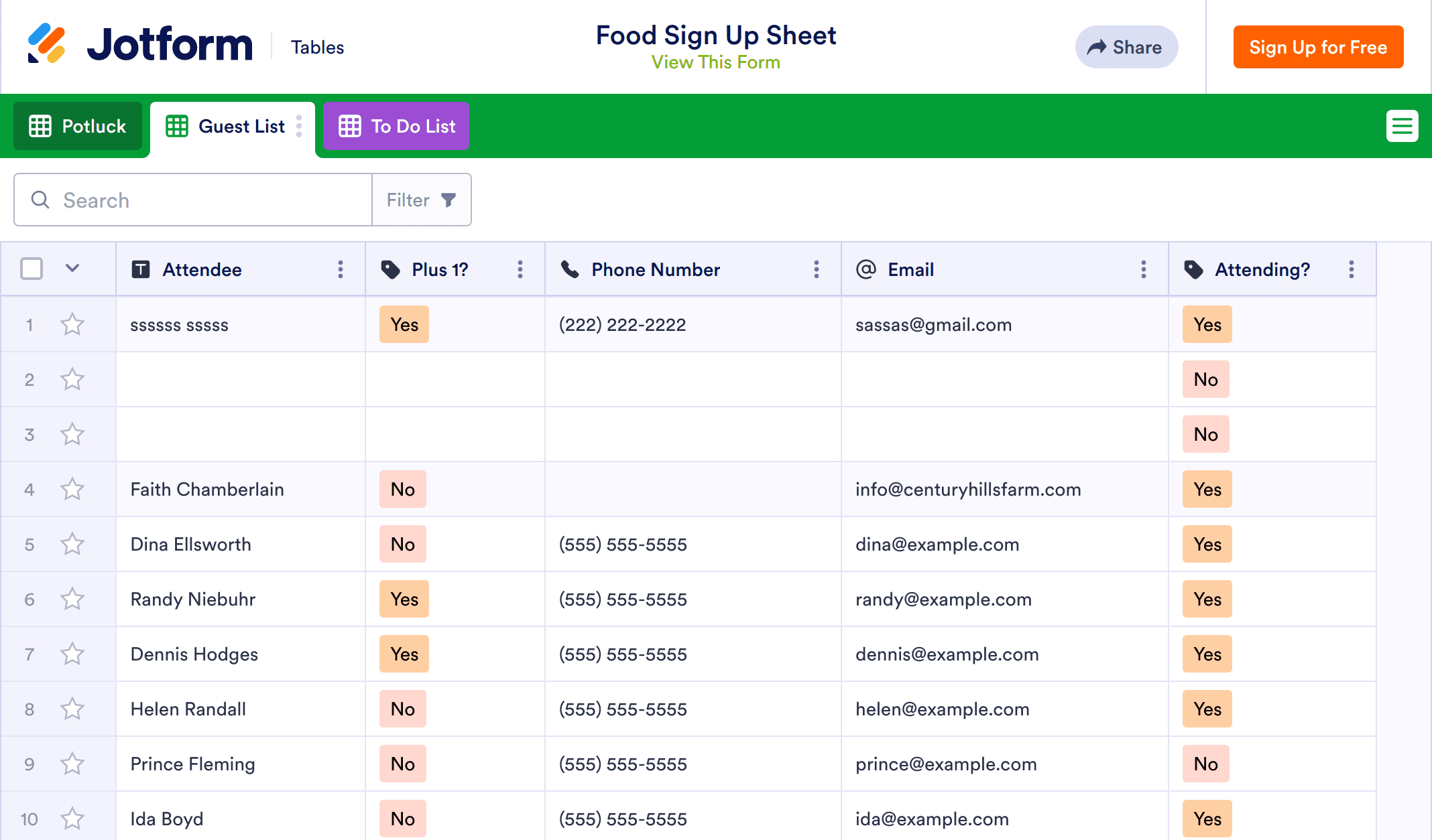 Whether you’re hosting a potluck or a picnic, find out what delicious dishes everyone’s bringing with this free online Food Sign Up Sheet! All you have to do is share the signup form created automatically from this sheet template and watch submissions appear in the spreadsheet! Guests can enter their name, what type of food they plan to bring, their dish and its ingredients, and whether or not they are bringing a plus one by filling out your form from any device.