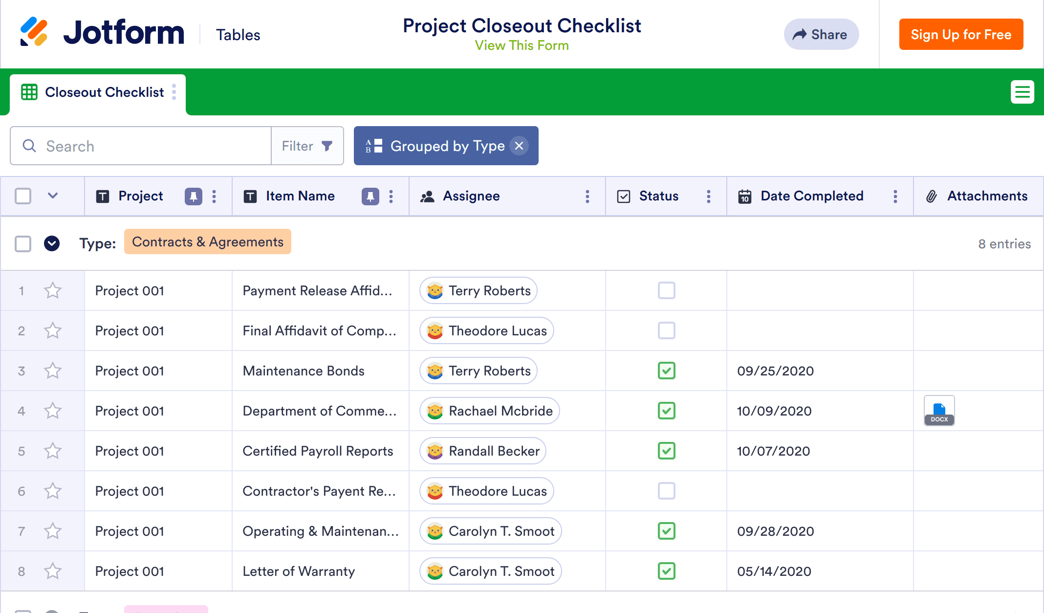 When you’re ready to finish up your project, you’ll want to run some tests and inspections to make sure everything is good to go. With Jotform’s free Project Closeout Checklist, you can easily organize project closeout information in a professional online spreadsheet that helps you track project status, completion dates, supporting files, and the responsibilities of team members. Quickly access your filled-in Project Closeout Checklist on any device — perfect for double-checking projects and signing off on them on the go.