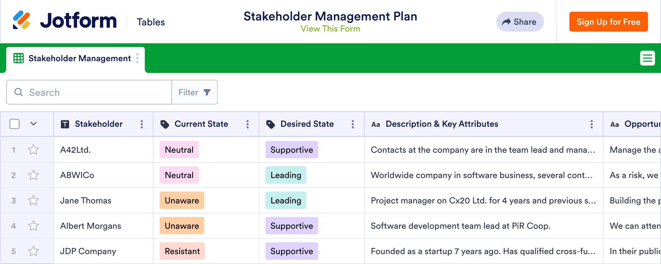 A stakeholder management plan is a document that outlines how stakeholders will be involved in the projects they’ve invested in. If you’re a project manager, use our free, online Stakeholder Management Plan to organize ideas on how to involve stakeholders so you can increase their positive impact on your projects. To get started, just enter important details like stakeholder name, current state of involvement, level of interest, action items, and more. You’ll be able to view and edit your Stakeholder Management Plan from any device, even offline with Jotform Mobile Forms.