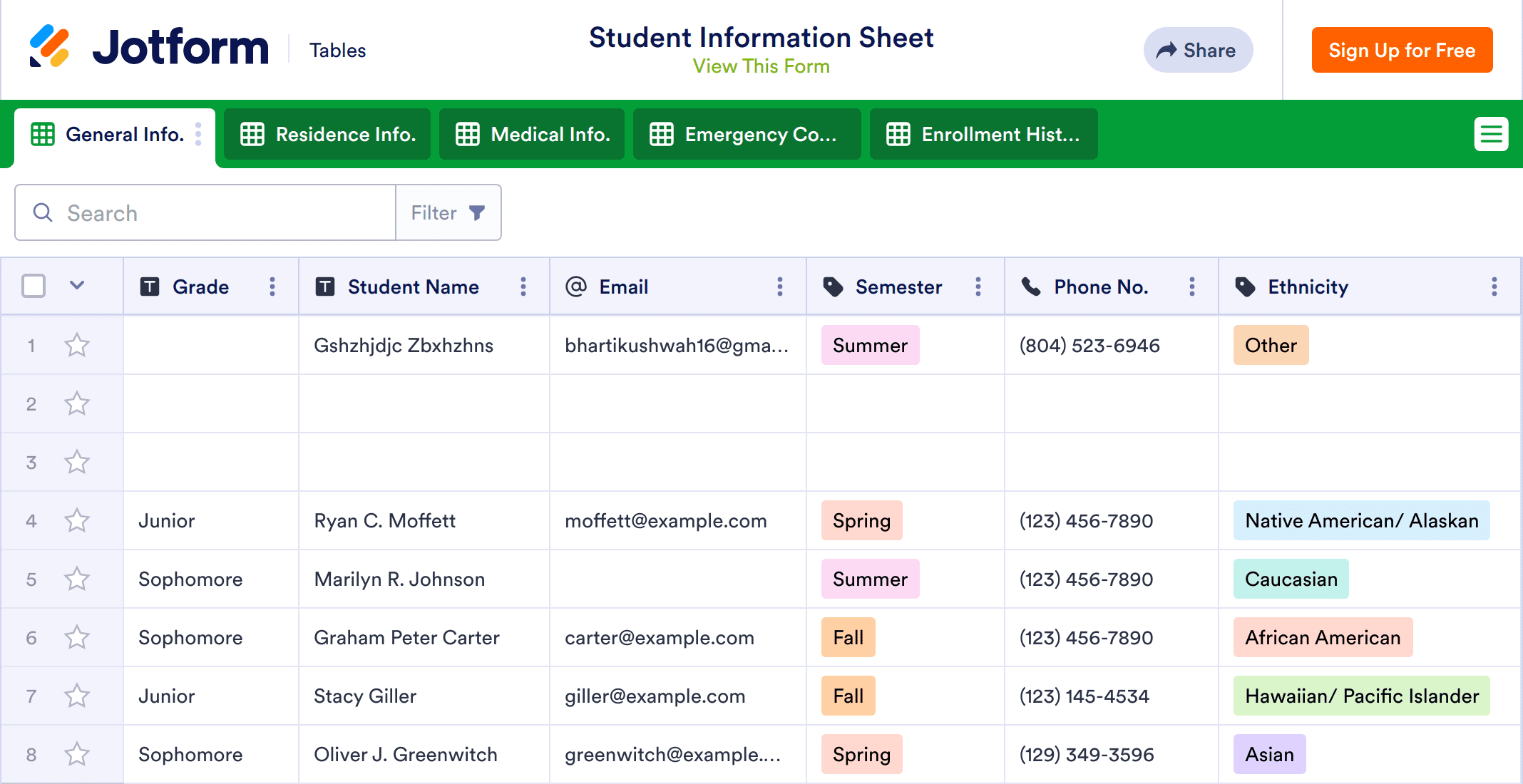 A student information sheet is used by teachers to collect various information about students. Whether you’re collecting student information for your class, school admission, or after-school programs, our free online Student Information Sheet will help you collect and store important student data in one secure place. To get started, simply customize and embed the attached form in your school website. Once students begin submitting their responses, their name, contact information, and personal details will automatically appear in the Student Information Sheet.