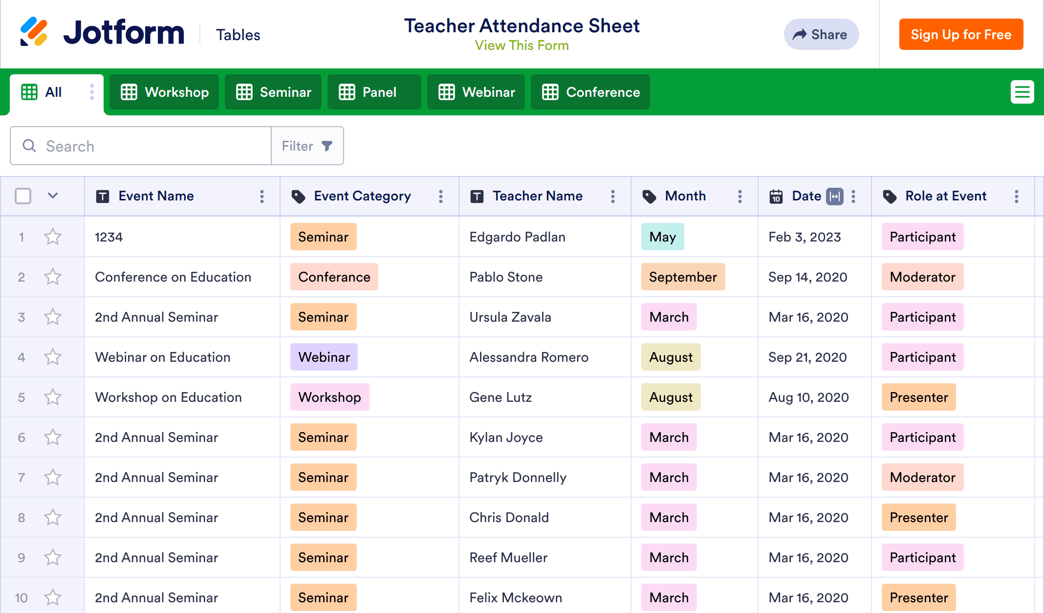 Jotform’s free online Teacher Attendance Sheet is perfect for educators and administrators at any school district. To take teacher attendance for workshops, webinars, and more, simply enter details about each teacher into the spreadsheet — or assign forms for teachers to fill out once they’ve attended the event. It’s the perfect way to track whether or not teachers were present for training events, conferences, and so much more.