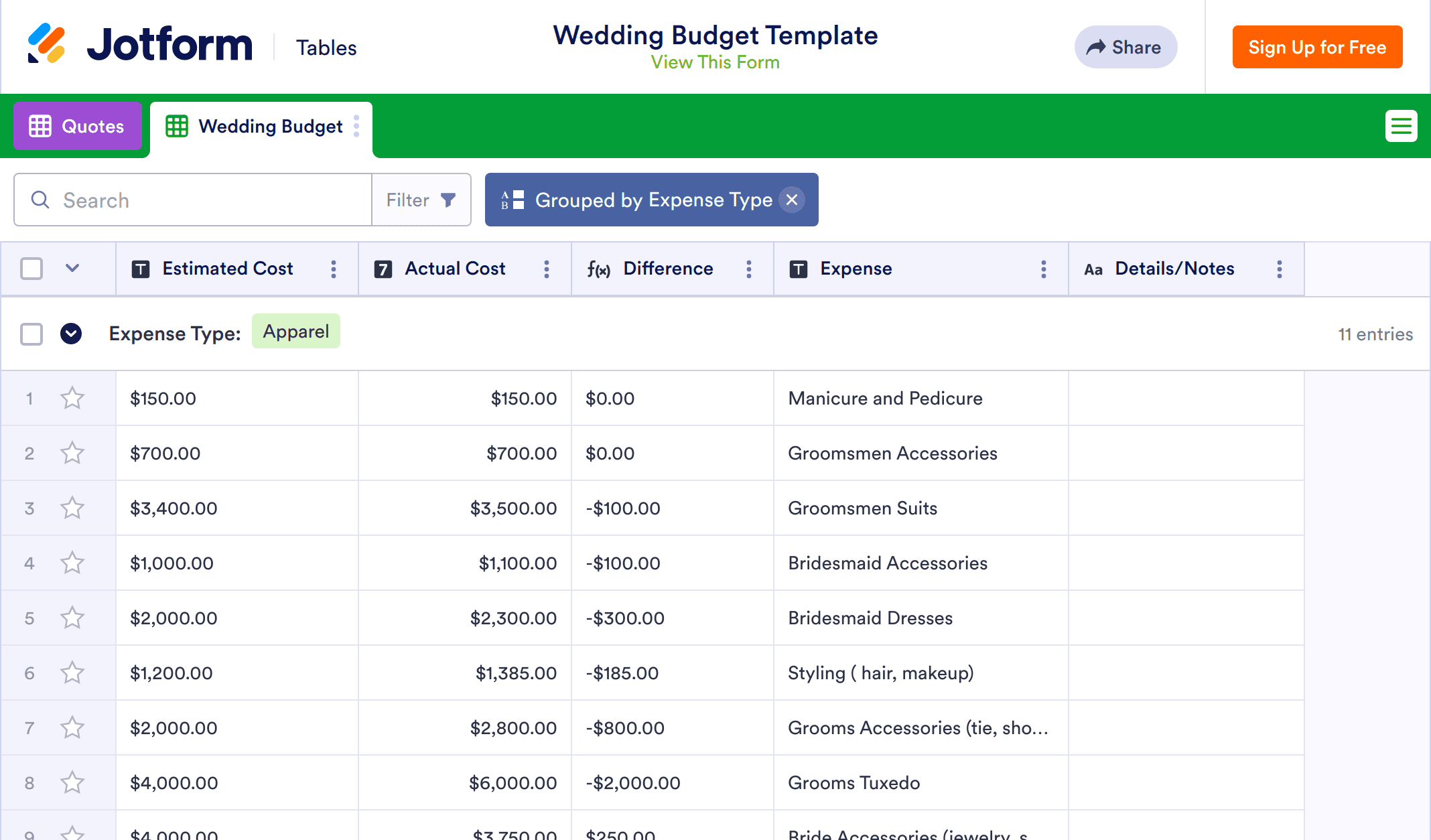 Customizing your Wedding Budget Template is simple. Add readymade column types, split info up into separate tabs, or use formulas to quickly calculate totals. And if you’re collaborating with others, do it in Jotform Tables’ all-in-one workspace, which lets you stay in full control of your data. On any couple’s special day, it’s important to make sure the event is as stress-free as possible — so make sure it all goes according to plan with Jotform’s free Wedding Budget Template.